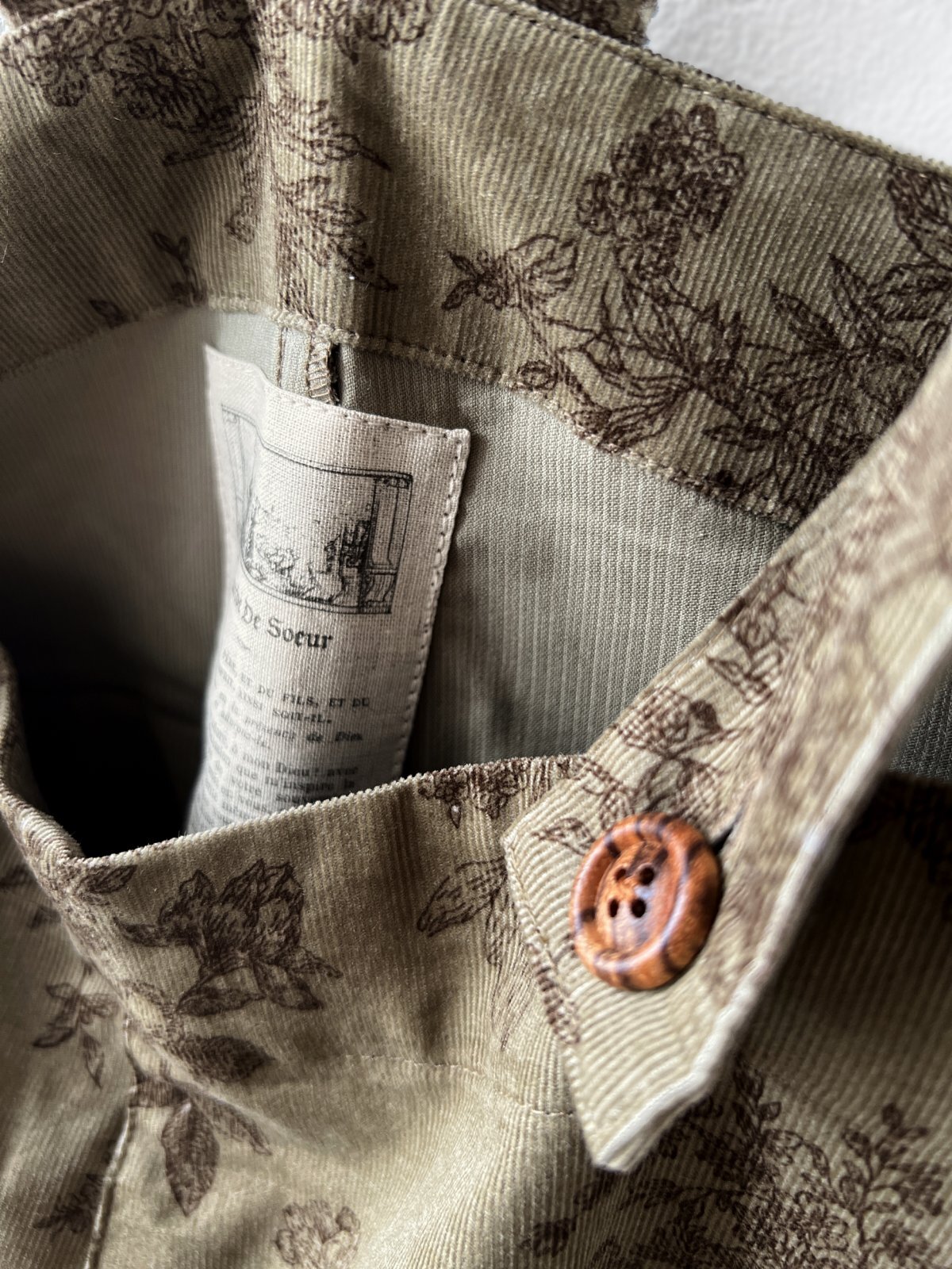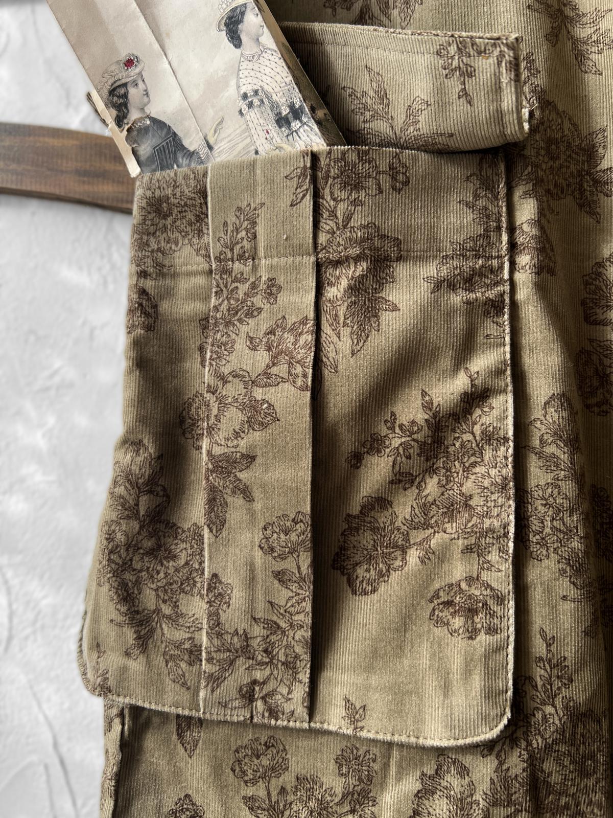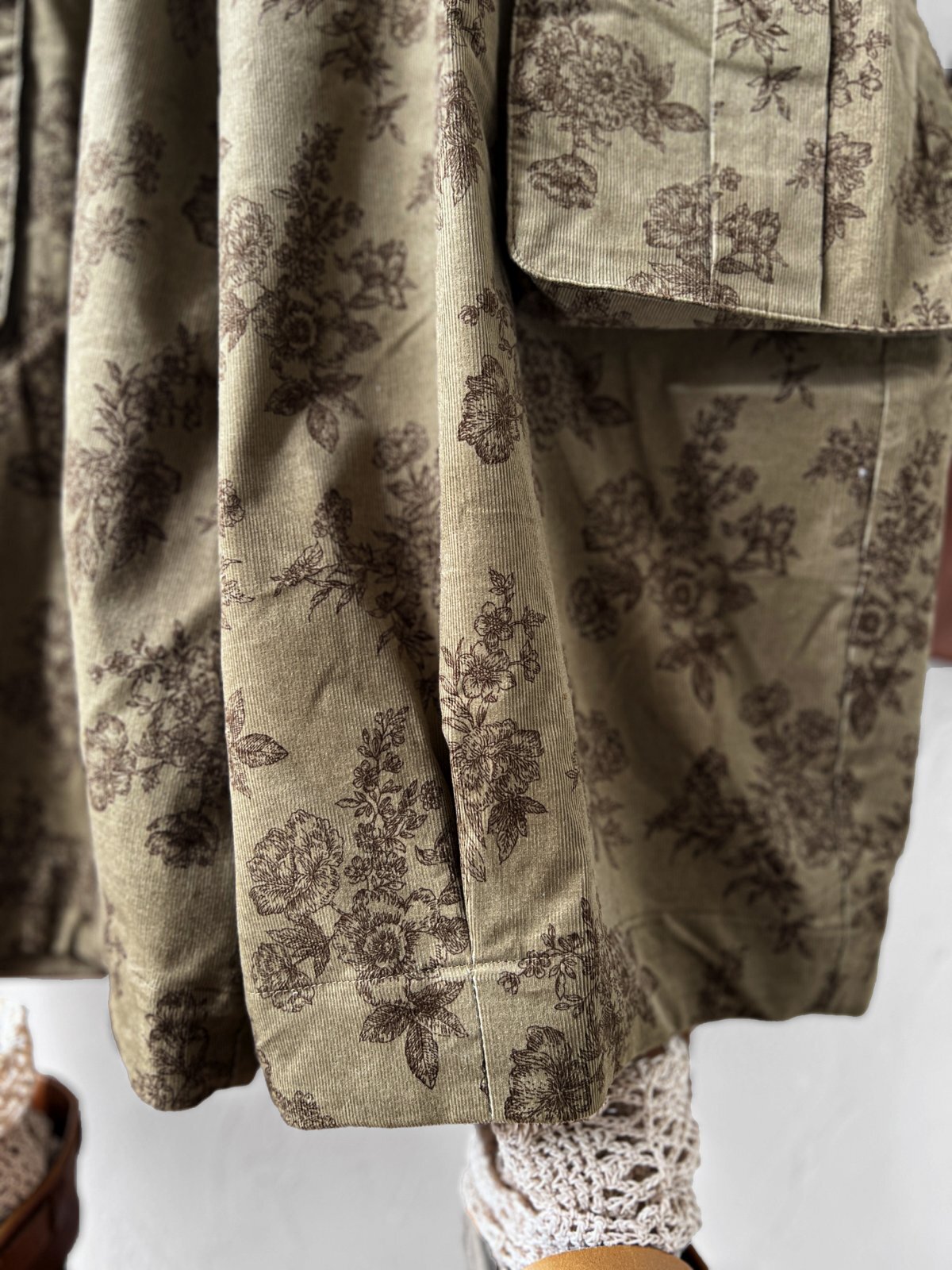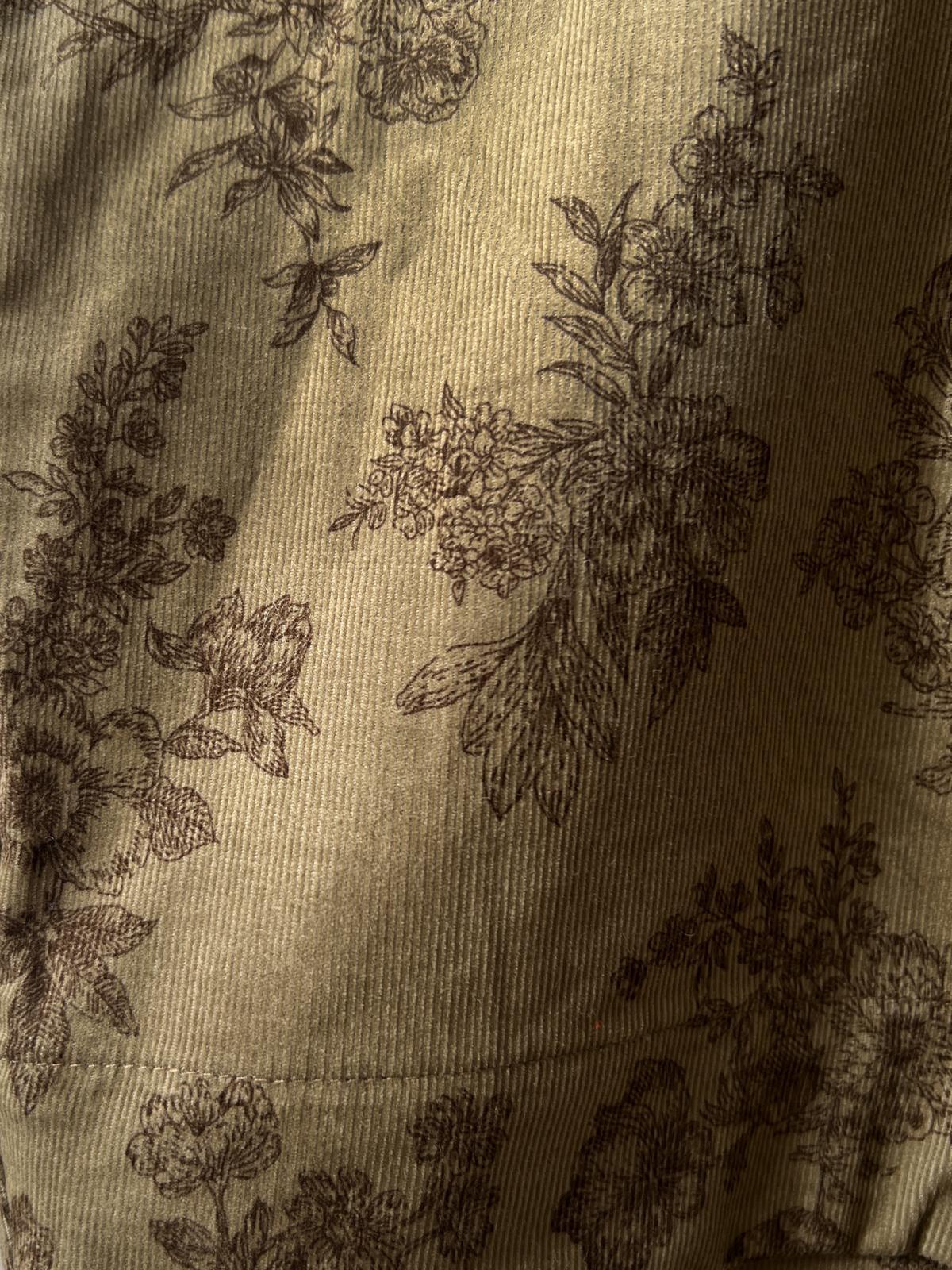 生地はカーキブラウンにボタニカル模様が入ったコールテン。