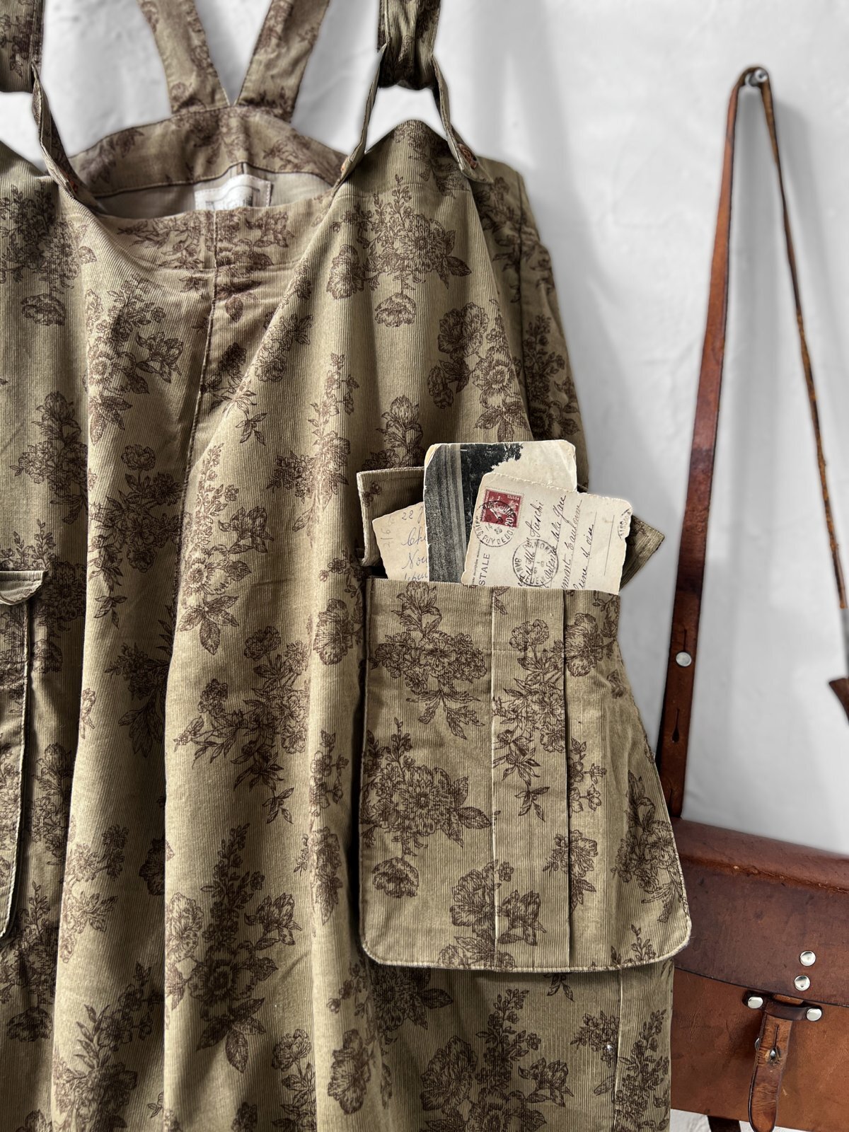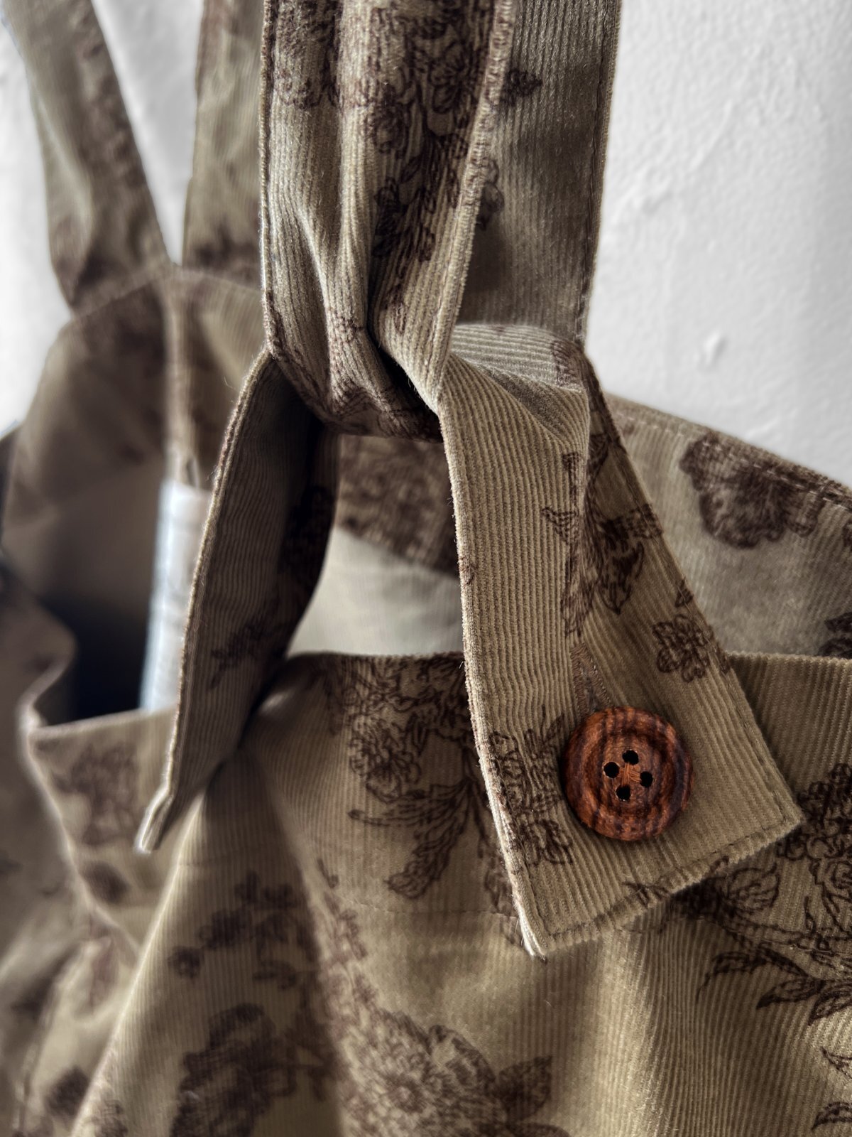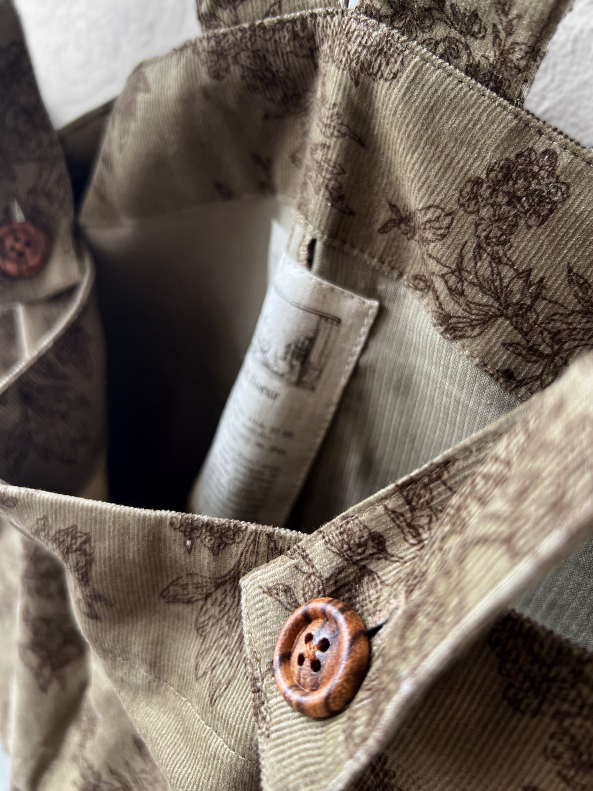 生地はカーキブラウンにボタニカル模様が入ったコールテン。