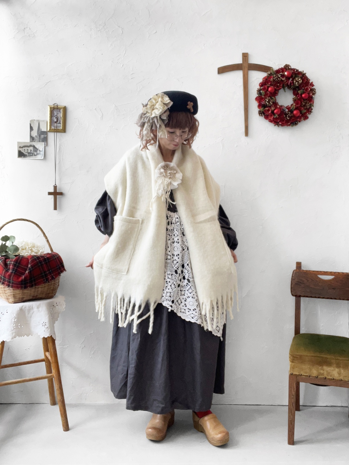 ▼お洋服とショールの2点以外の、撮影で使用している小物は付きません。