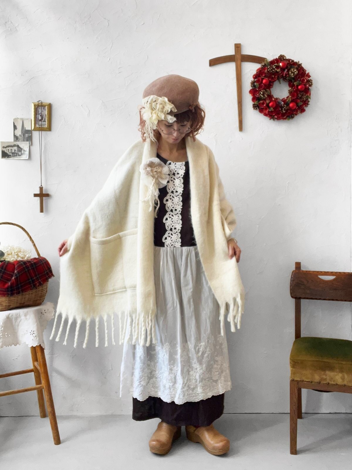 (2)pollenbienco アンティークレースコサージュ付きポケットショール