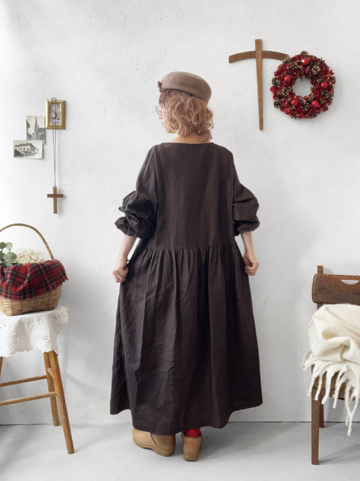 しっとりチョコブラウン色のリネン。大きなパフスリーブに