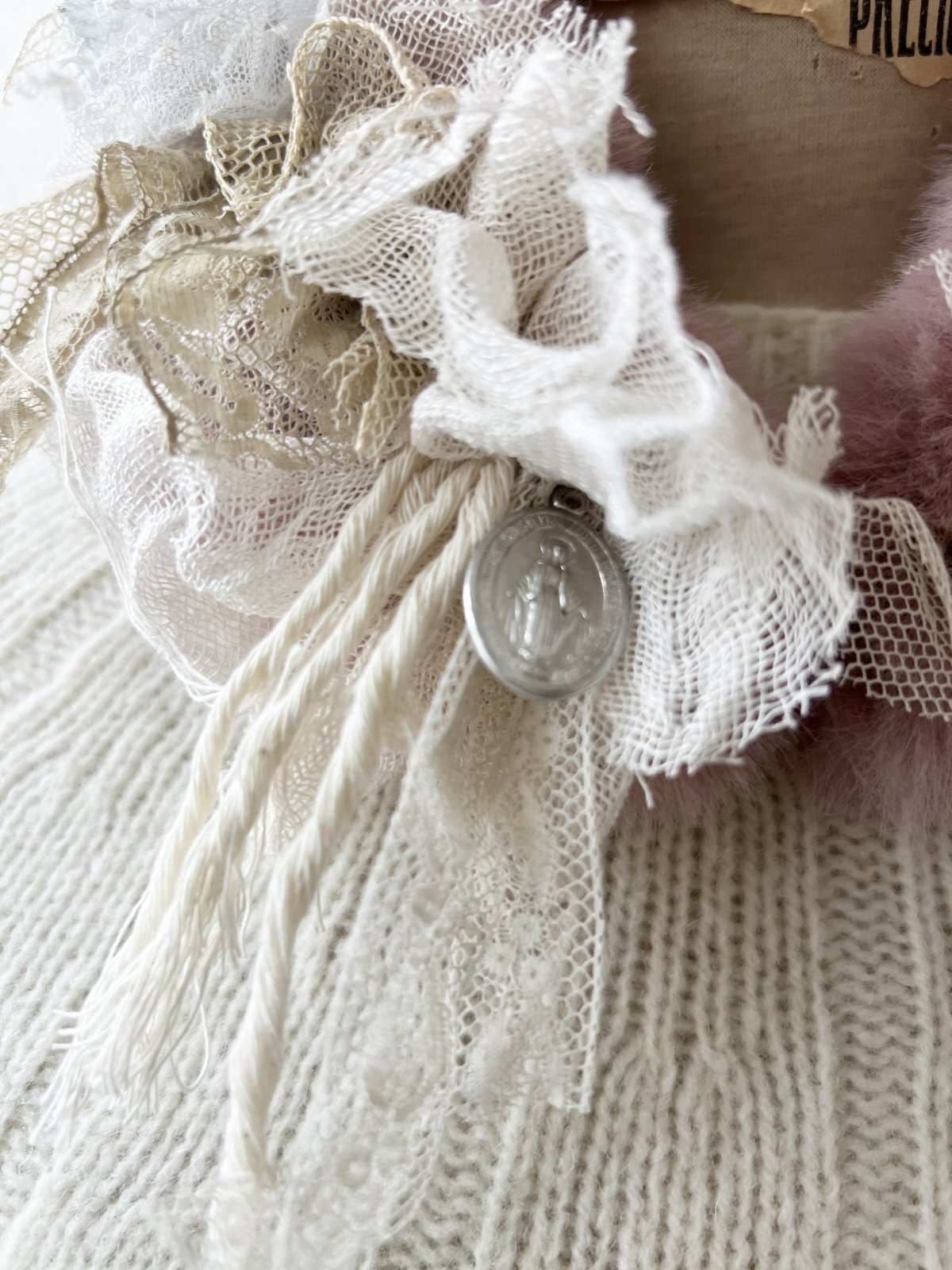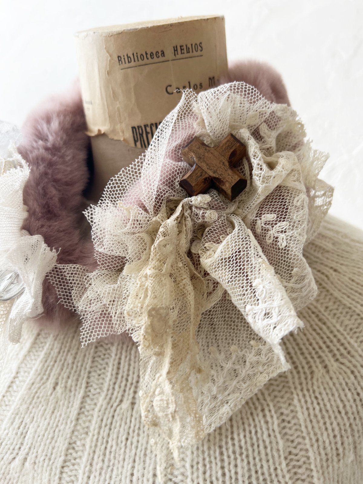 アンティークレースや聖母のメダイ、木の十字架ブローチを