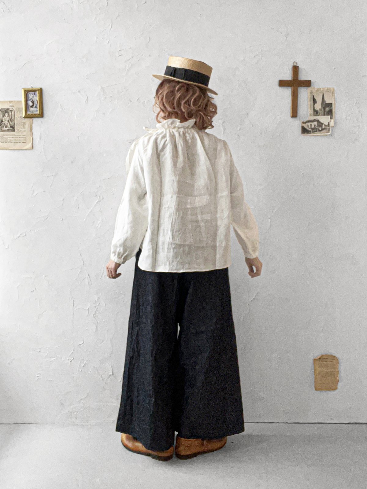 フリルの立ち襟にりぼんを通して、