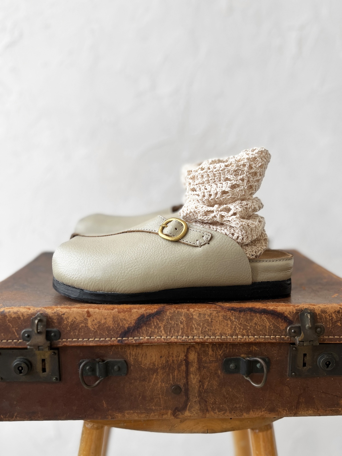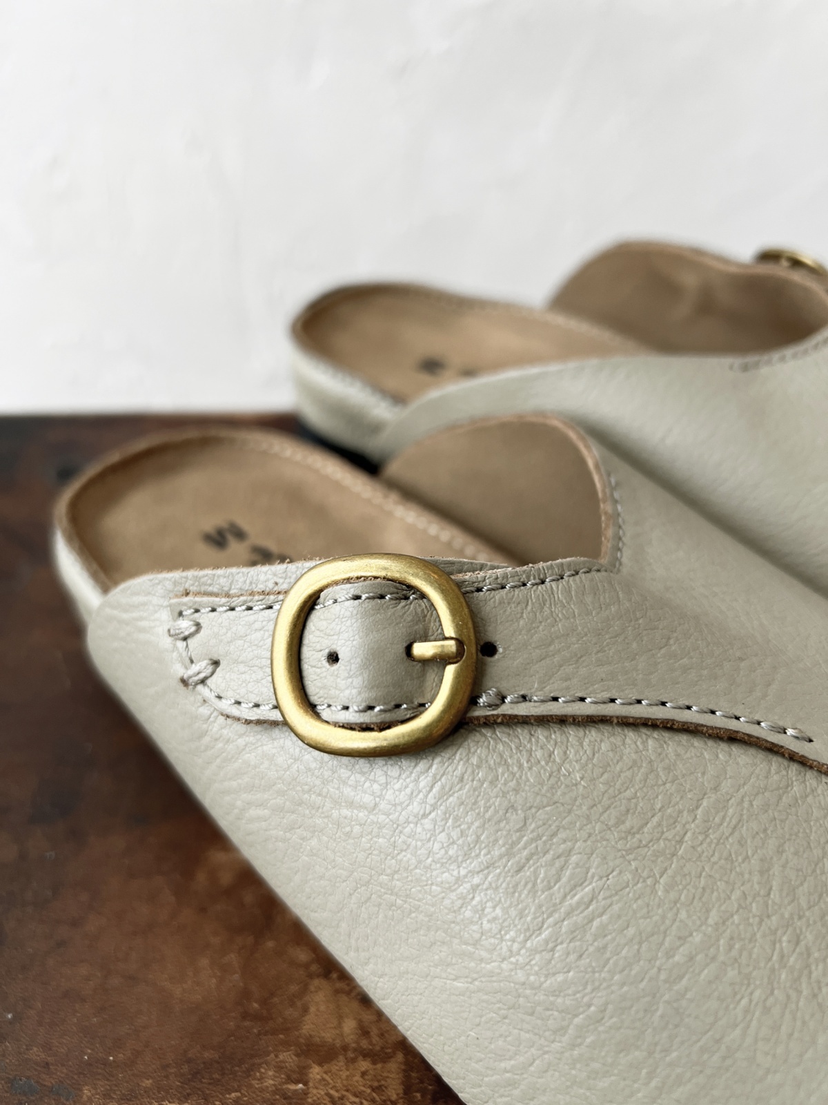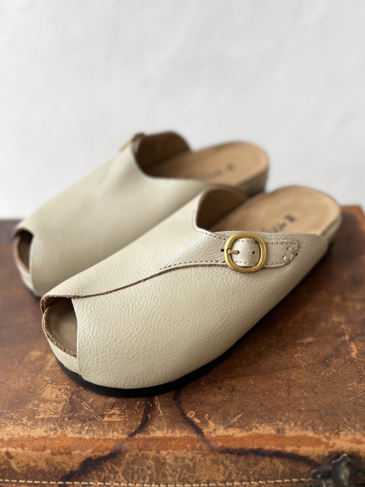 すっぽりと丸く包み込むような形のレザーサンダル。