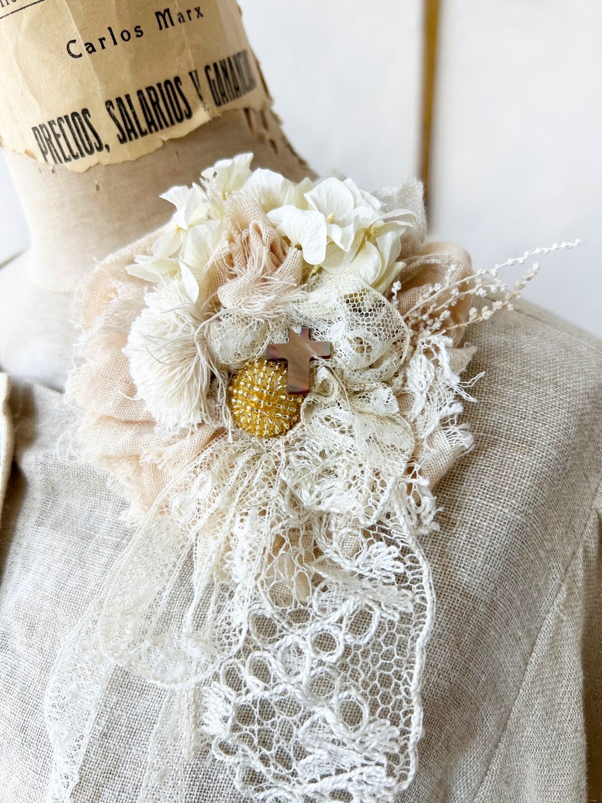 pollenbienco/アンティークレースとプリザーブドフラワーのコサージュ・C
