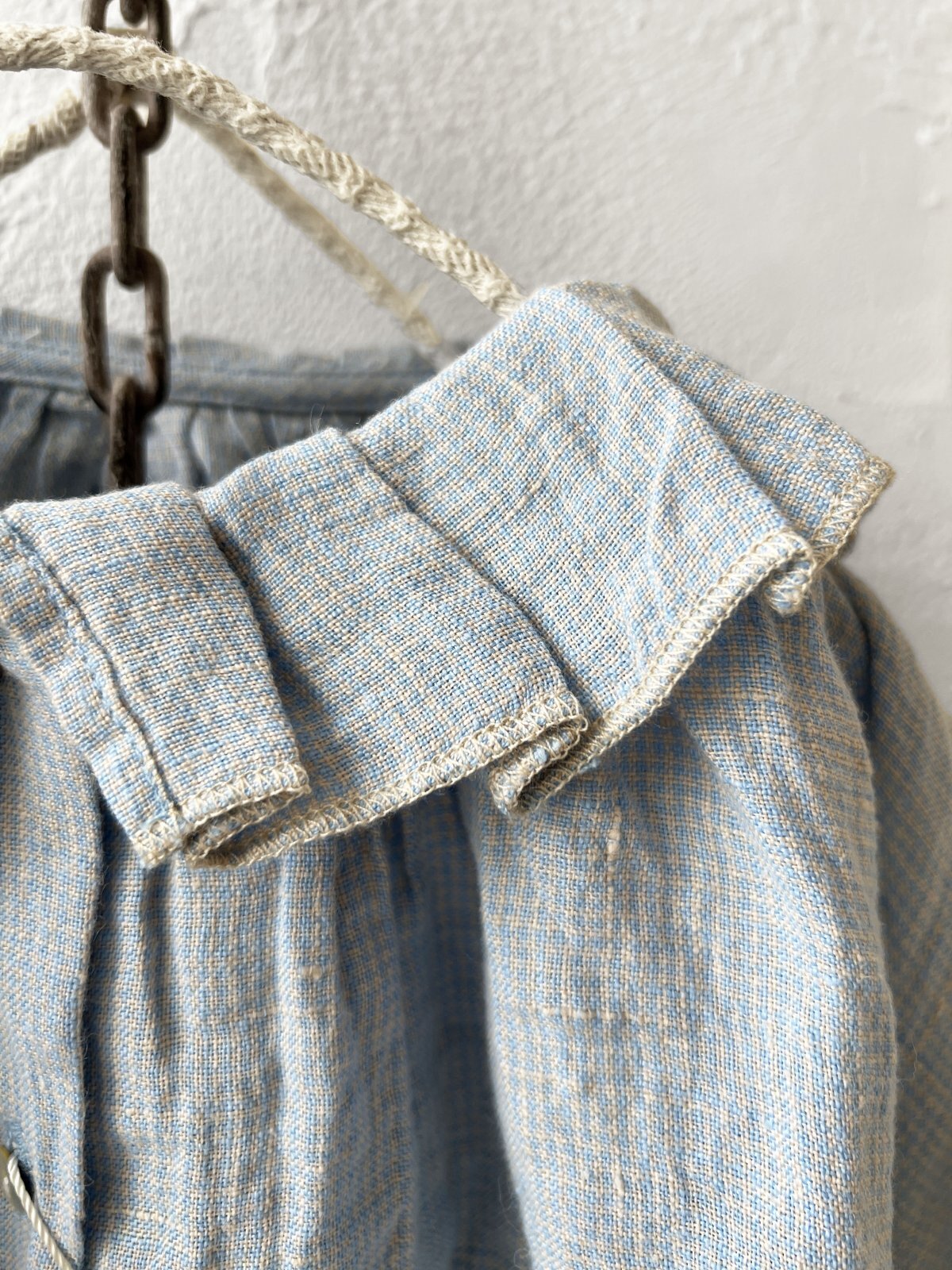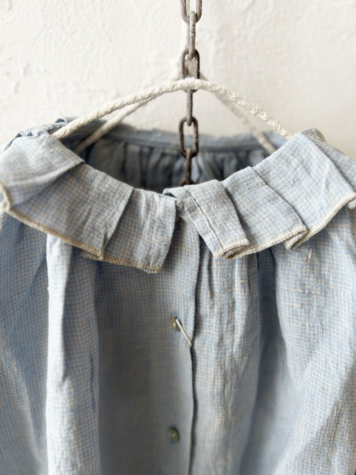 サックスブルーと生成りの細かなギンガムチェックです。