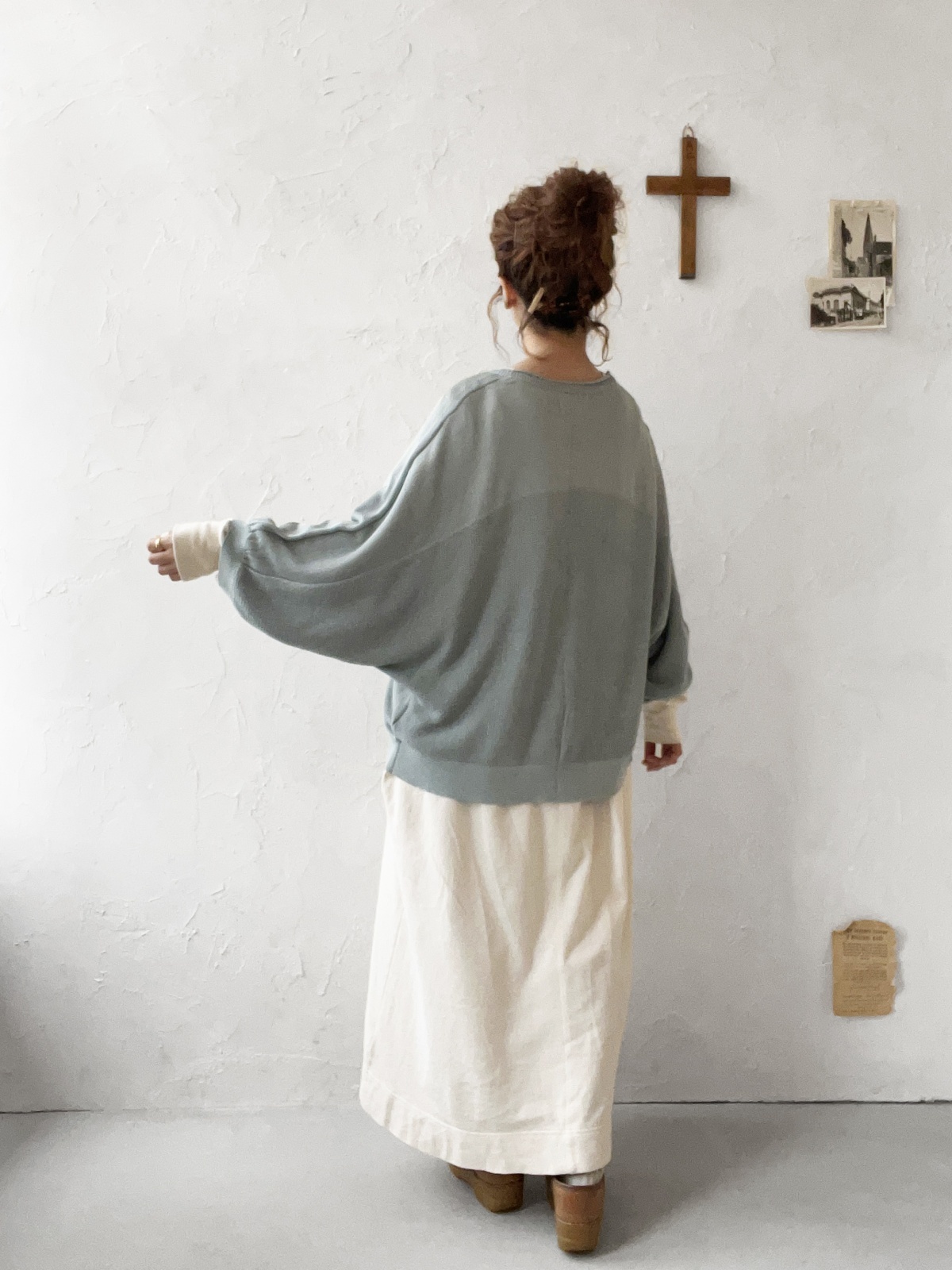 お袖は7分袖程度。バックスタイルの編み地の変化が