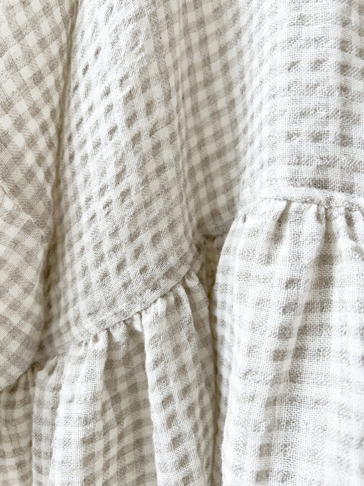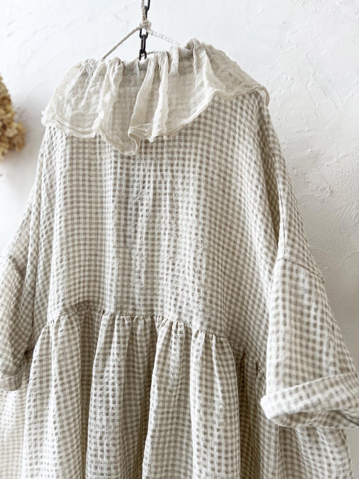襟には ふわふわの生成りのリネンガーゼ、