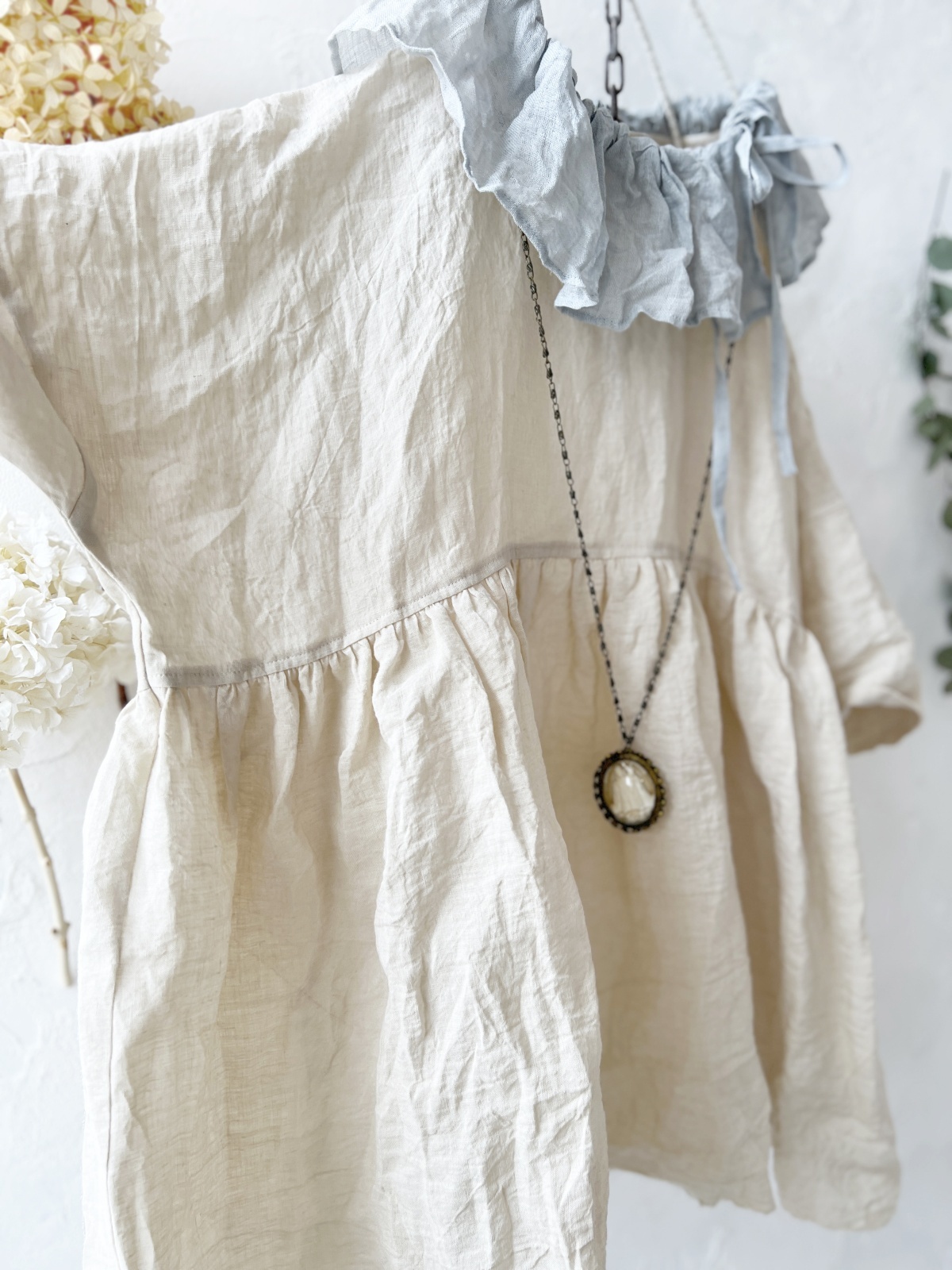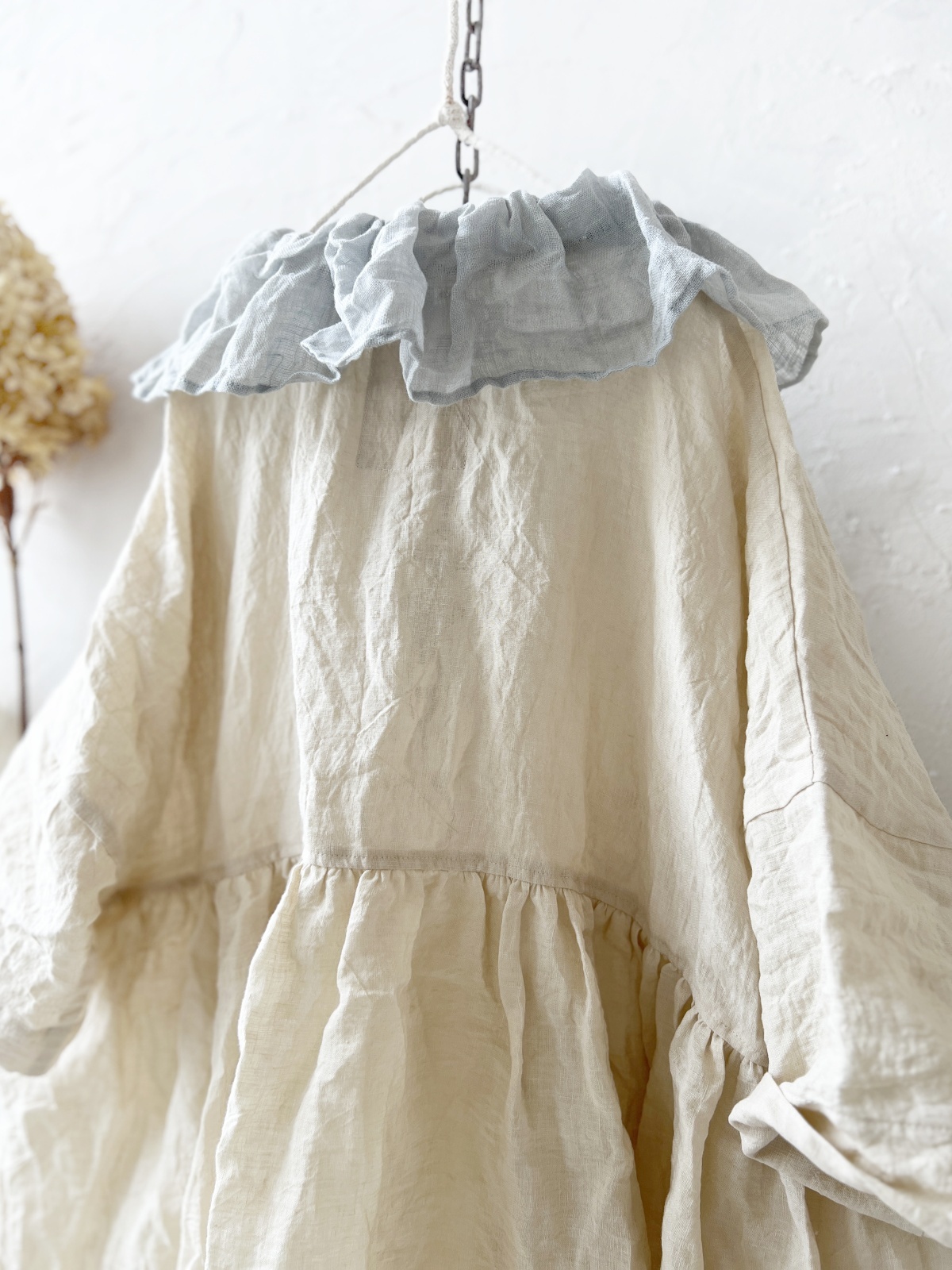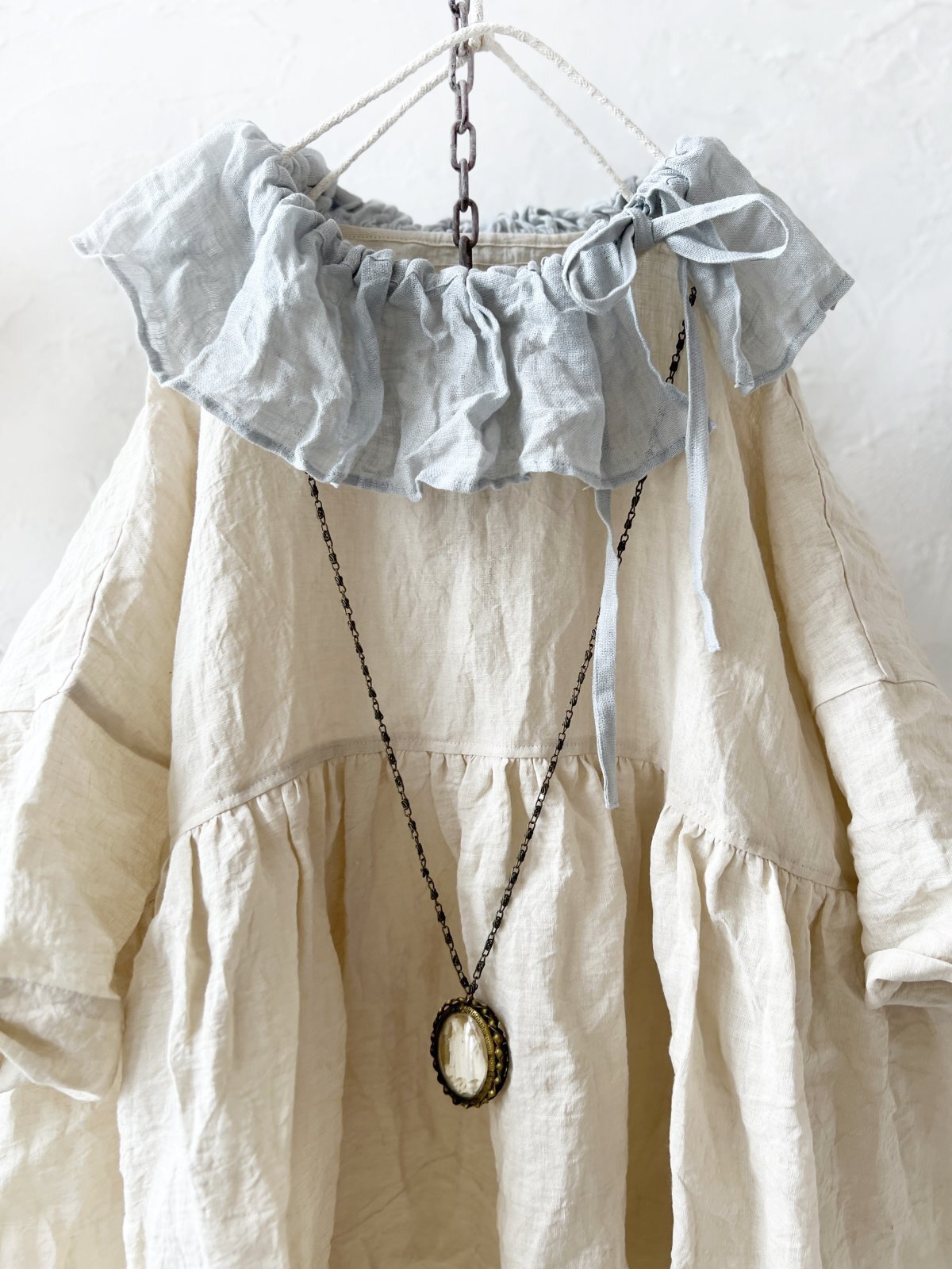 襟には うすグレーのファナージュリネン。