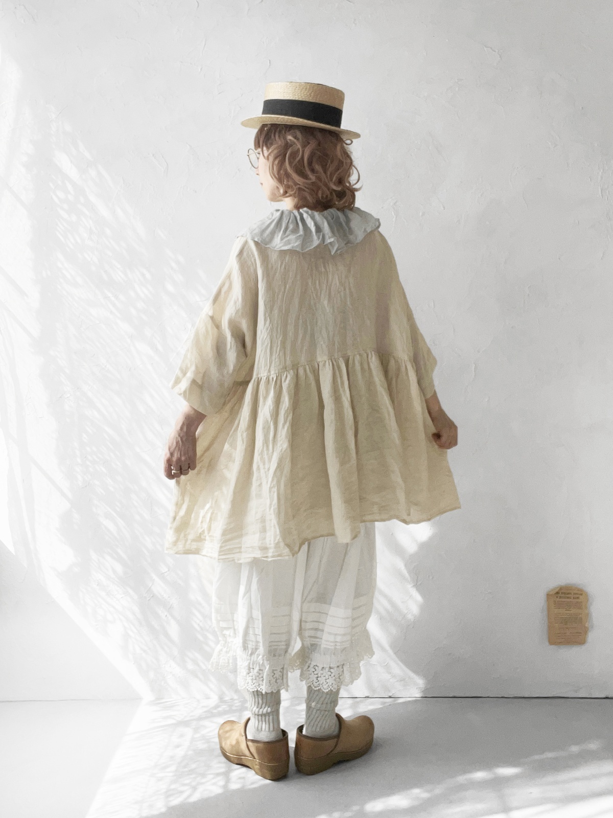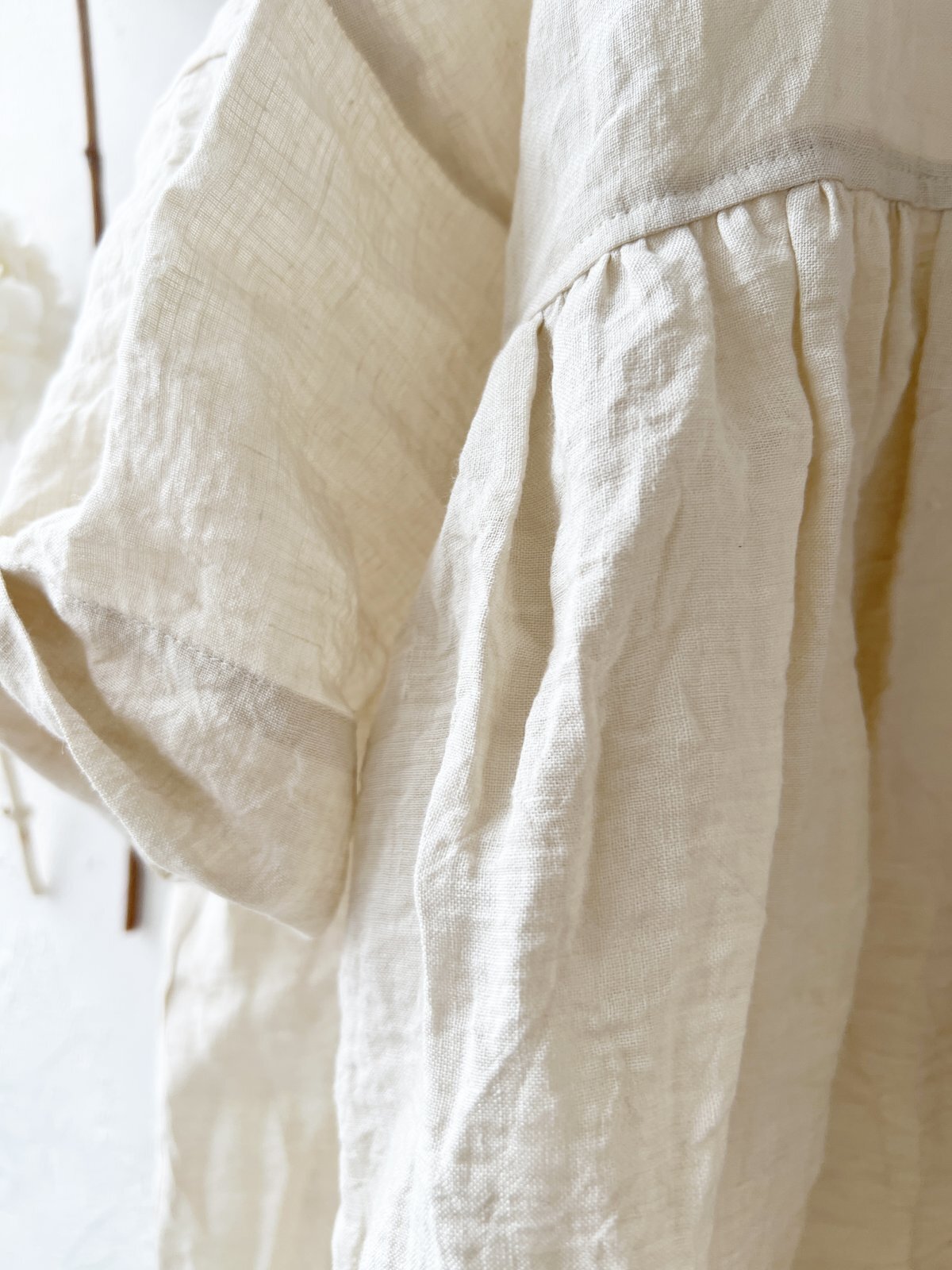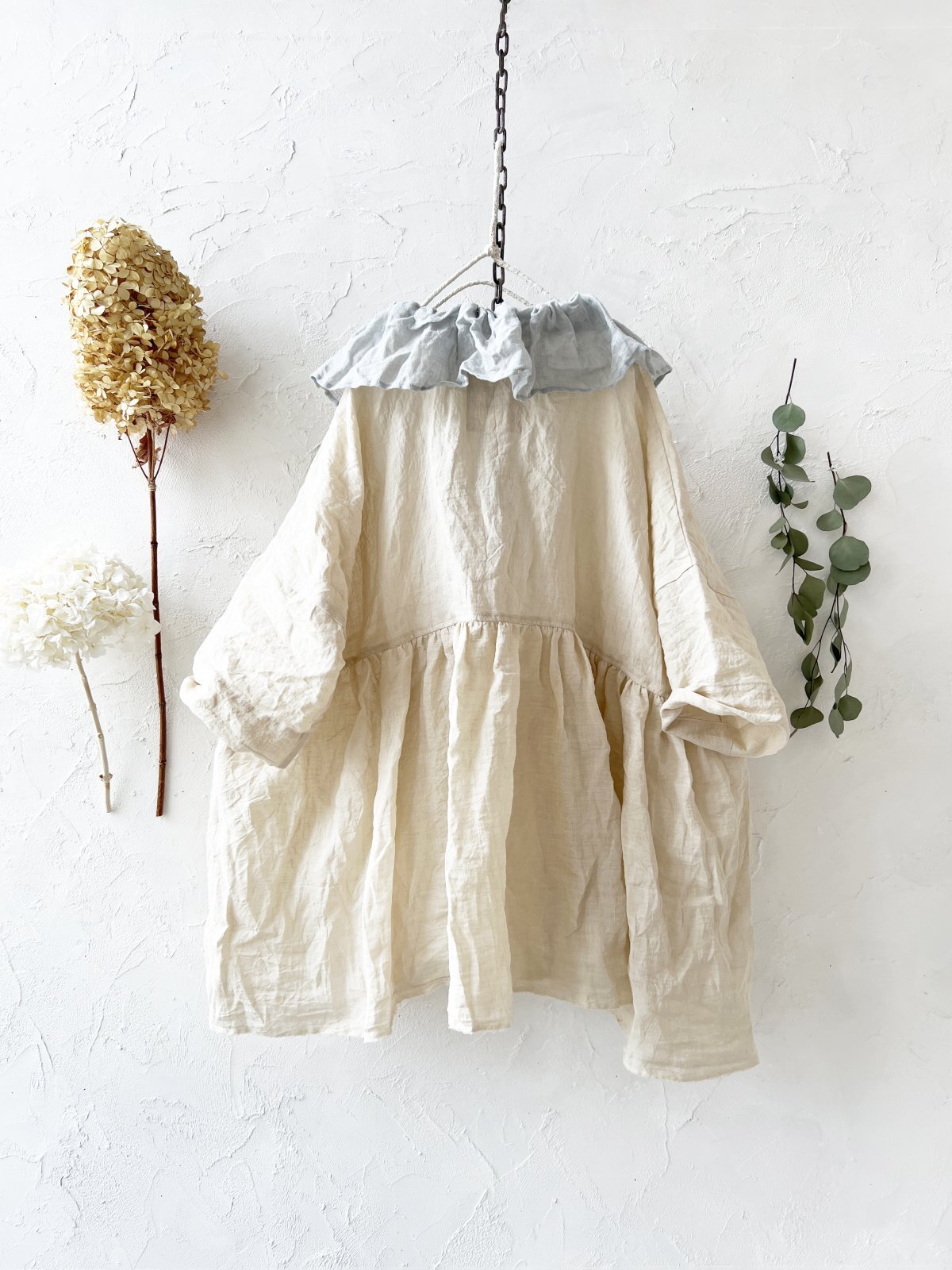 襟には うすグレーのファナージュリネン。