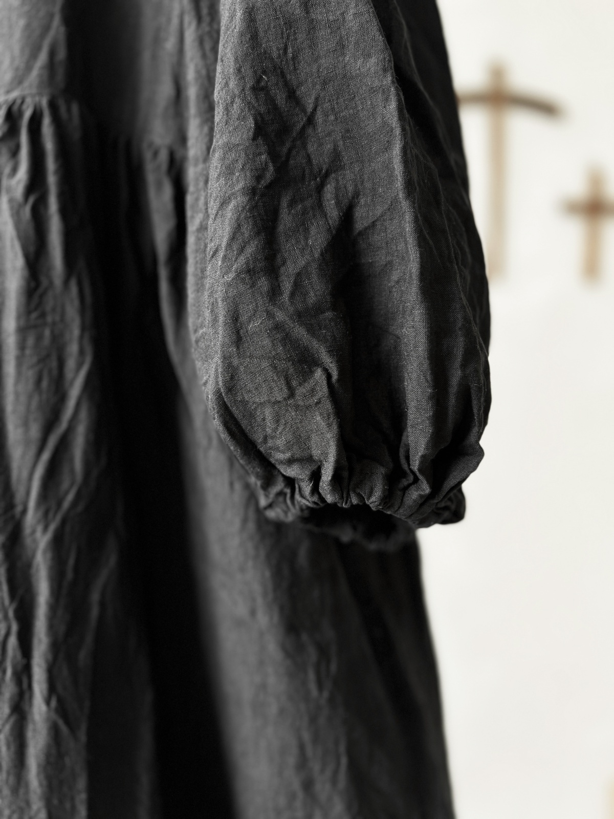 肩からのふっくらpuffで、ボリュームスリーブのワンピース。